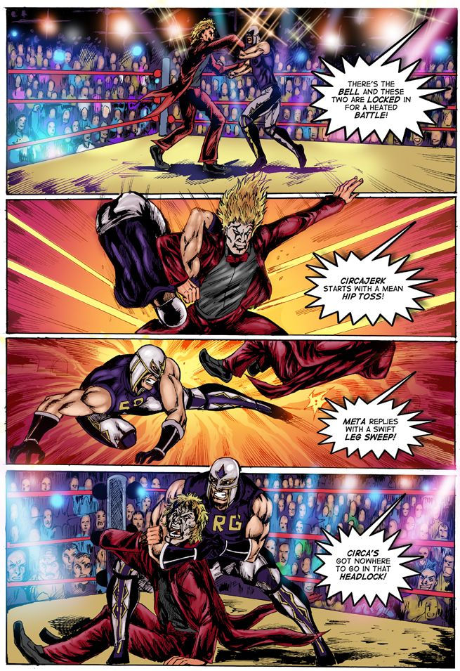 The squared circle meets superheroic action as the pro wrestler/superhero META makes his full-length comic book debut! After multiple stakeout operations and information gathering, Meta now takes the fight to the Gestapo as he storms the Establishment to break its grip on Leo City and its populace. Will he take on the Establishment alone, or is he able to rally allies to fight with him on this siege?